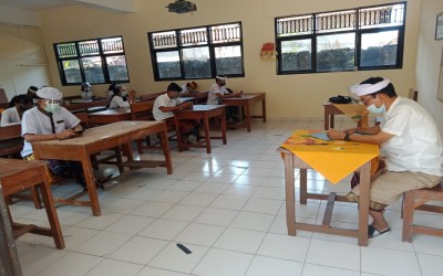 Ujian Sekolah siswa kls 9 secara daring di sekolah.Siswa ke sekolah melaksanakan ujian melalui media HP dengan aplikasi e-learning melajah.id. Kegiata