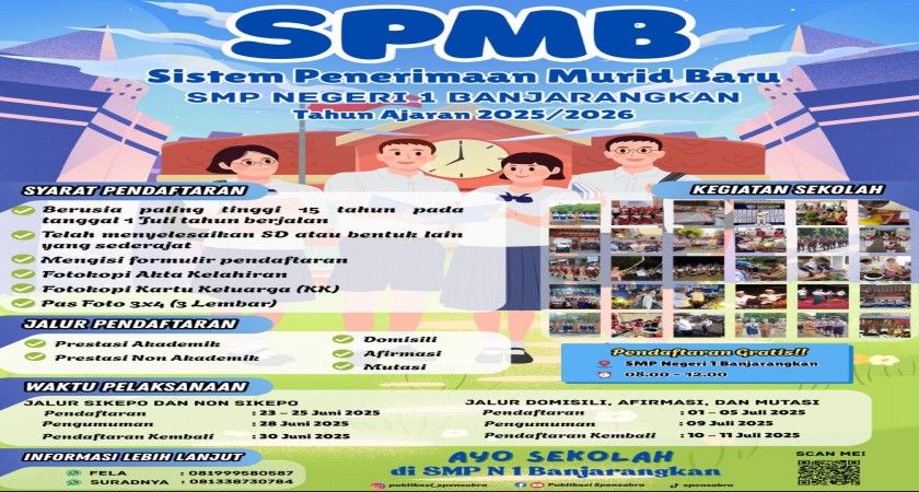 Sistem Penerimaan Murid Baru (SPMB) 2025 di SMP Negeri 1 Banjarangkan dilaksanakan secara online.